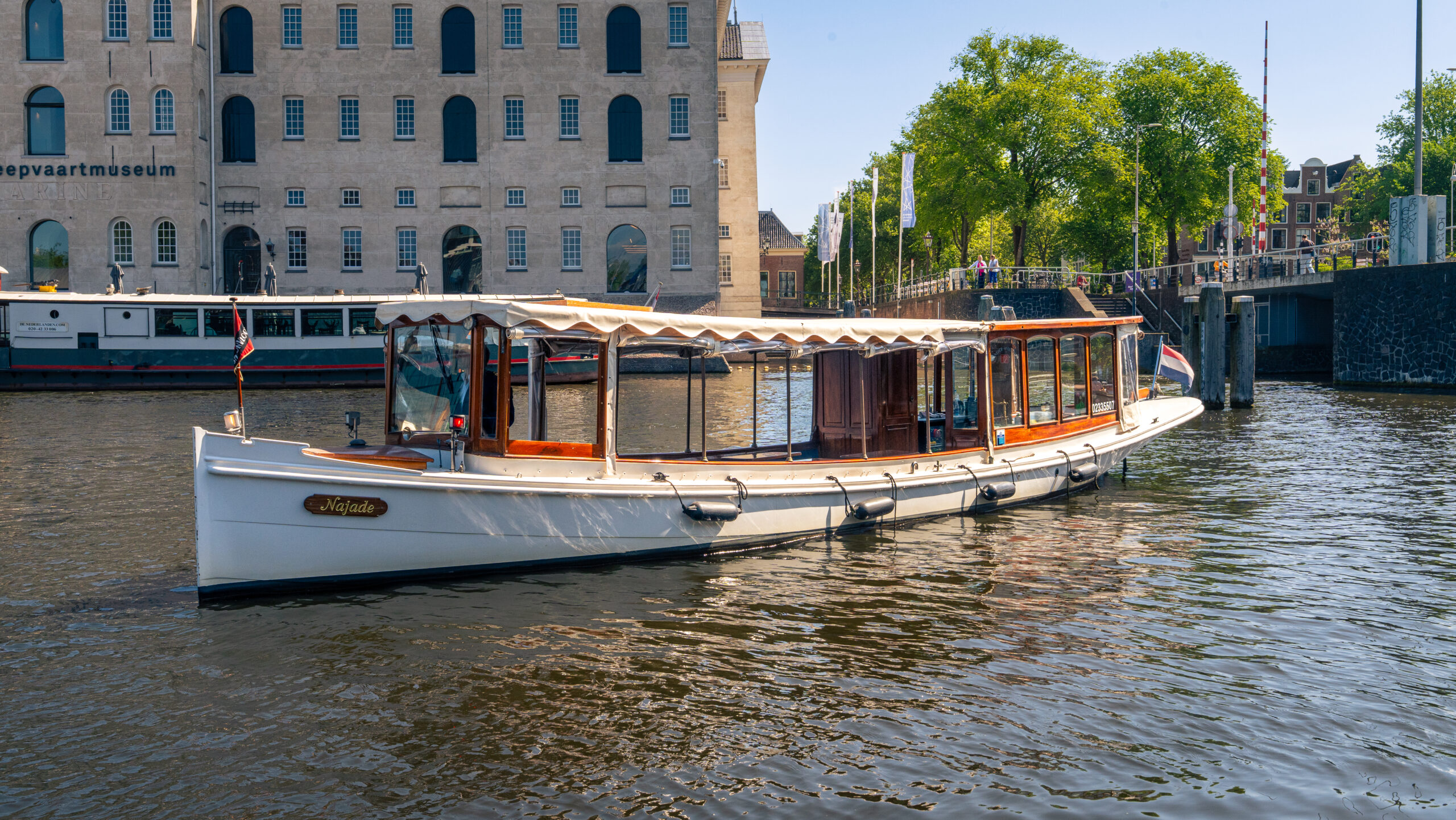 The Najade is a slender saloon boat built in Groningen in 1907, commissioned by Mr. K. H.E Oving. After years of private ownership, the boat was sold to coal club Wilhelmine Victoria. After thorough restoration, the Najade has been sailing in and around Amsterdam since 1999. Fully renovated again in 2022, the Najade can proudly be called the gem on the canals of Amsterdam. The Najade is a year-round saloon boat that can be used for stylish cruises. In nice weather the sides can be opened, in winter this classic saloon boat is closed and heated.